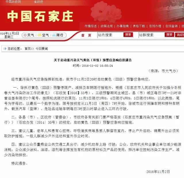 经石家庄市重污染天气应急指挥部批准,石家庄市于11月2日20时启动黄色(Ⅲ级)预警应急响应。