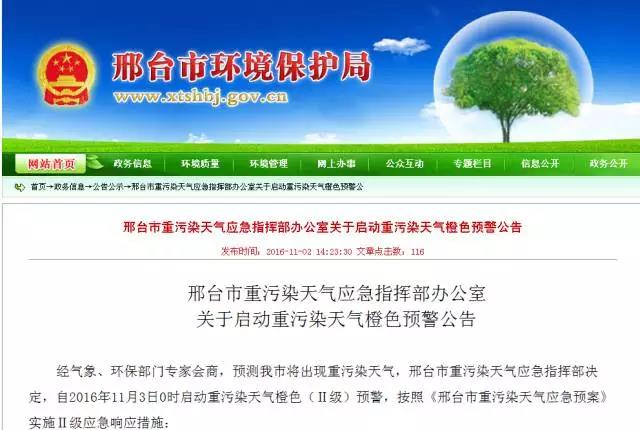 经气象、环保部门专家会商,预测邢台市将出现重污染天气,邢台市重污染天气应急指挥部决定,自2016年11月3日0时启动重污染天气橙色(Ⅱ级)预警,按照《邢台市重污染天气应急预案》实施Ⅱ级应急响应措施: