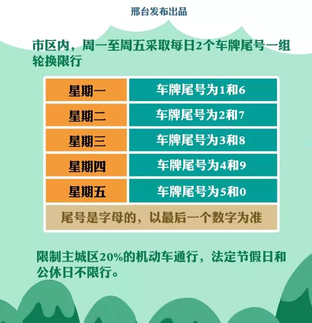 实行交通管制。除城市运行保障车辆和执行任务特种车辆外,市区内禁止核定载质量为2吨(含)以上的货车(办理通行证的除外)、三轮汽车、低速载货汽车、拖拉机和无标车、黄标车通行。引导过境车辆避开主城区行驶。市区内,周一至周五采取每日2个车牌尾号一组轮换限行(车牌尾号分为1和6、2和7、3和8、4和9、5和0 五组,尾号是字母的,以最后一个数字为准)的方式,限制主城区20%的机动车通行,法定节假日和公休日不限行。加大公共交通运力。每日具体限行时间为:早7:00——晚21:00点。