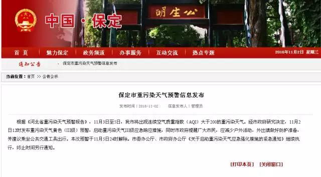 根据《河北省重污染天气预警报告》,11月3日至5日,保定市将出现连续空气质量指数(AQI)大于200的重污染天气。经市政府研究决定,11月2日12时发布重污染天气黄色(Ⅲ级)预警,启动重污染天气Ⅲ级应急响应措施,同时市政府提醒广大市民,应减少户外活动,外出请做好防护准备,并建议乘坐公共交通工具出行。本次预警于11月5日24时解除。市委办公厅、市政府办公厅《关于启动重污染天气应急强化措施的紧急通知》继续执行,终止时间另行通知。