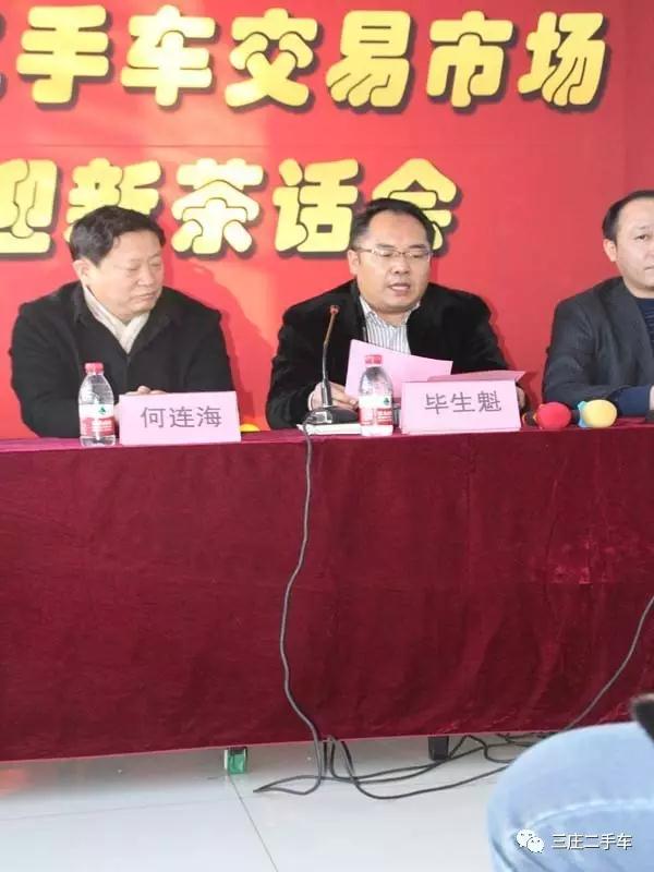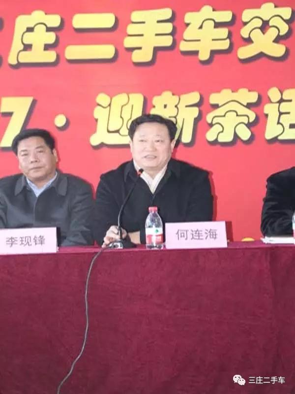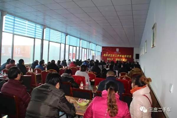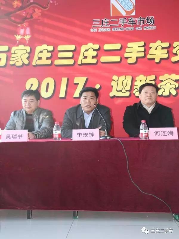 2017年1月10日,石家庄三庄二手车交易市场2017年迎新茶话会在市场五号展厅三楼举行。河北省商品交易市场联合会会长何连海、石家庄市新华区上城派出所警官李占东、石家庄三庄二手车交易市场总经理李现锋、常务副总经理毕生魁、副总经理吴瑞书以及市场优秀经销商和市场员工代表170余人参加了会议,本次大会由市场办公室主任董立强主持。