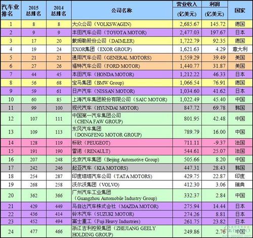 根据7月下旬美国《财富》杂志发布的2015年全球财富五百强榜单,盖世汽车网整理出汽车制造商排名,总共有24家车企上榜,其中中国车企占据6个席位,数量为各国之首。